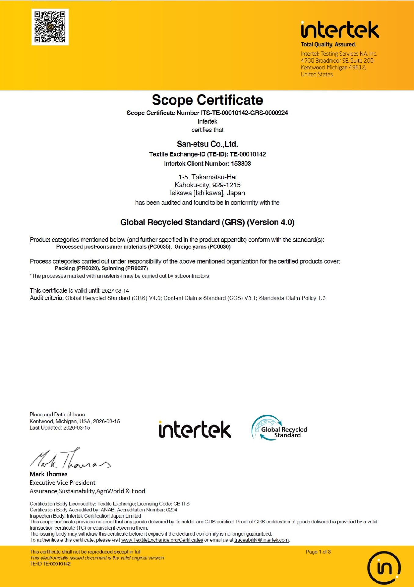 山越株式会社(本社:石川県かほく市、代表取締役:孫怡満)は、国際認証機関 Intertek Testing Services NA inc. による GRS(Global Recycled Standard)の更新認証を2026年3月15日に再取得しました。 今後も、GRS認証製品のリサイクルポリエステル加工糸をお取扱い致します。